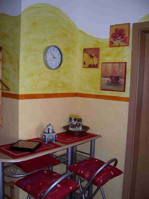 Schlafraum, Wohnküche und Bad. Wohnküche: Küchenzeile (Backofen, Kühlschrank), Sitzbar, Sitzgruppe).